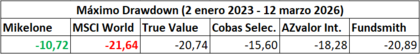 Ahí lo tienen amigos, la cartera Mikelone es con mucha diferencia la que tiene un menor drawdown máximo con un -10,72%, nada más y nada menos que aproximadamente la mitad de lo que ha tenido el MSCI World con un -21,64%. El Fundsmith y el True Value han tenido un drawdown máximo del -20,89% y -20,74% respectivamente. El AZvalor internacional un -18,28% y el Cobas Selección un -15,60%. La cartera defensiva funciona tal y como se espera que lo haga, estamos en modo defensivo y en este modo no queremos ser los más rentables, queremos hacerlo más o menos bien, pero durmiendo tranquilos. Tener una rentabilidad en algo más de tres años de aproximadamente un 30%, con un drawdown tan bajo, pues la verdad es que no está mal.