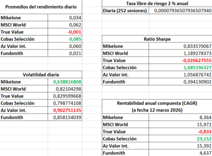 En el 2025 el Cobas Selección se salió del mapa con un 31,39% de revalorización, y en el extremo opuesto nuestro amigo Terry Smith y su Fundsmith se dejó un -4,86%. La cartera Mikelone hizo un pobre 4,10%. En el YTD hay muchas diferencias entre unos y otros. El MSCI World está plano, con un 0,21%, los amigos de AZvalor Internacional lo están haciendo muy bien con su cartera orientada al petróleo y este año llevan un 19,39%, pero la cartera Mikelone con un 10,34% tampoco lo está haciendo nada mal, al igual que el Cobas Selección con un 9,29%. Los que no levantan el vuelo en lo que llevamos de año son el Fundsmith que lleva un -6,23% y el True Value con un -9,27%.