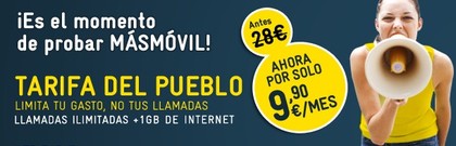 Tarifa del Pueblo tiene una cuota de mensual de 28€, pero MásMóvil la está ofreciendo hasta el 31 de mayo, por 9.90€/mes durante los 3 primeros meses. ¿Qué os parece esta nueva oferta de MÁSMóvil?